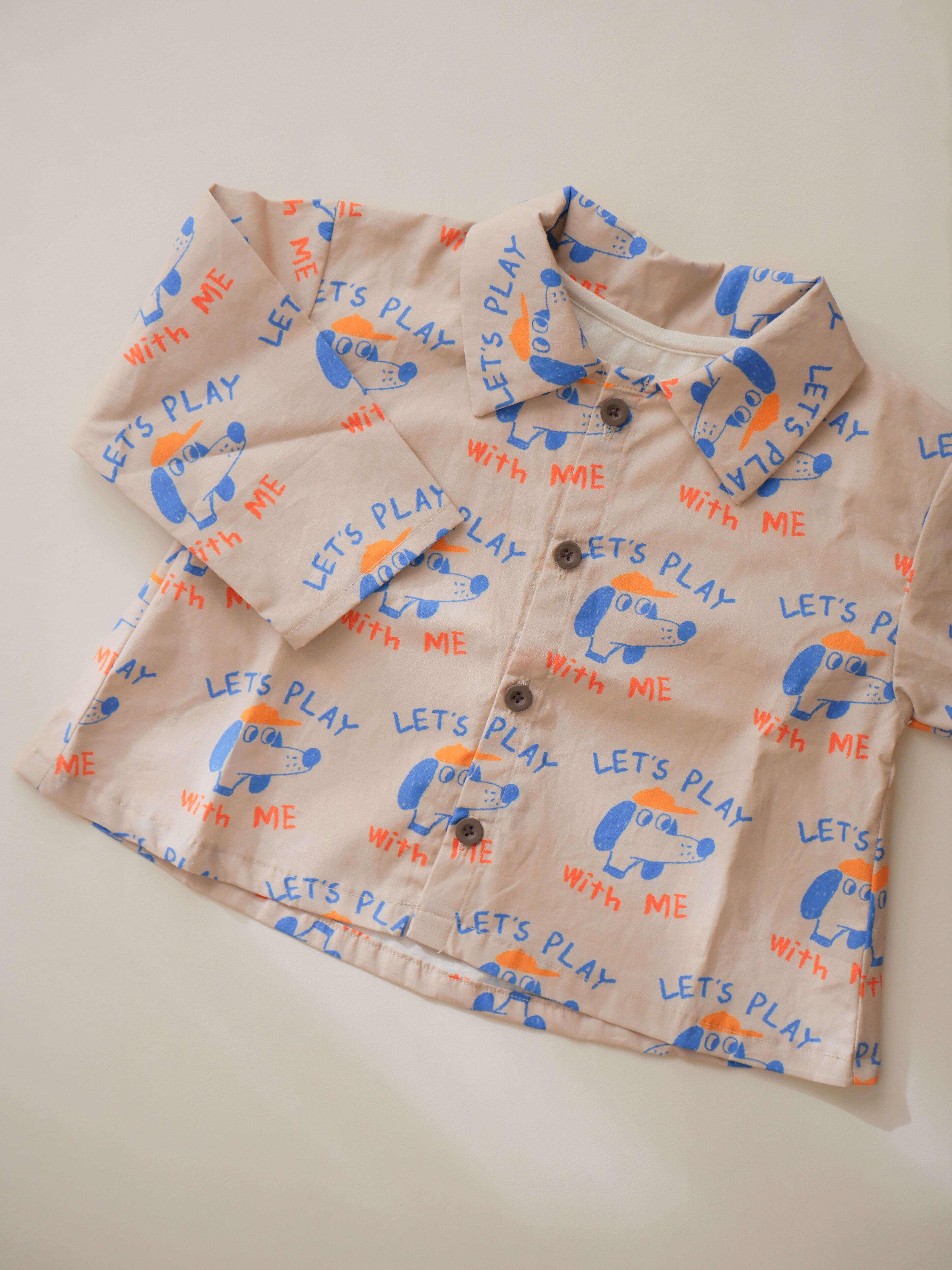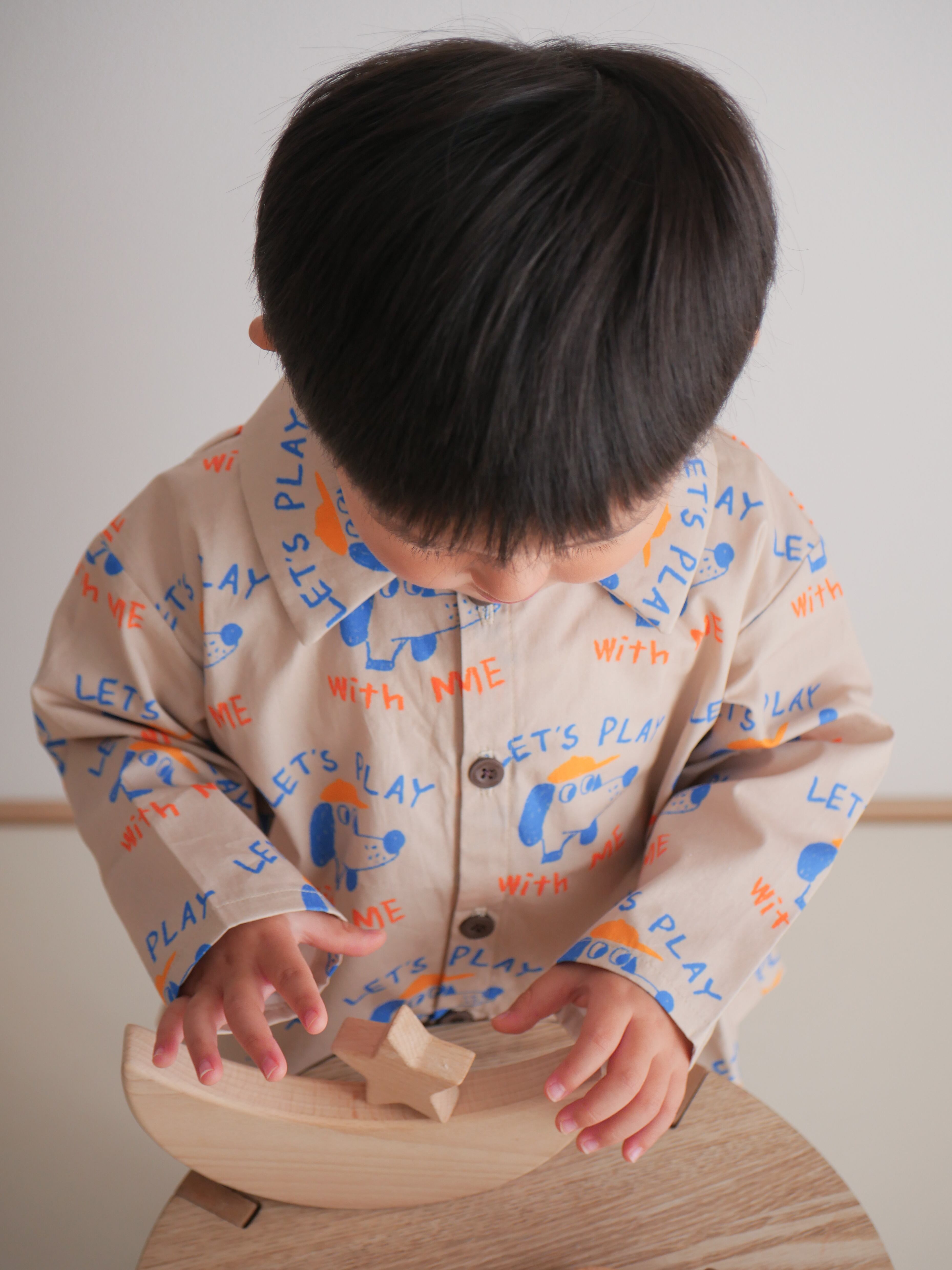元気いっぱいのワンちゃんが描かれた、遊び心あふれるシャツです「LET’S PLAY with ME」の文字が楽しい雰囲気をプラス。