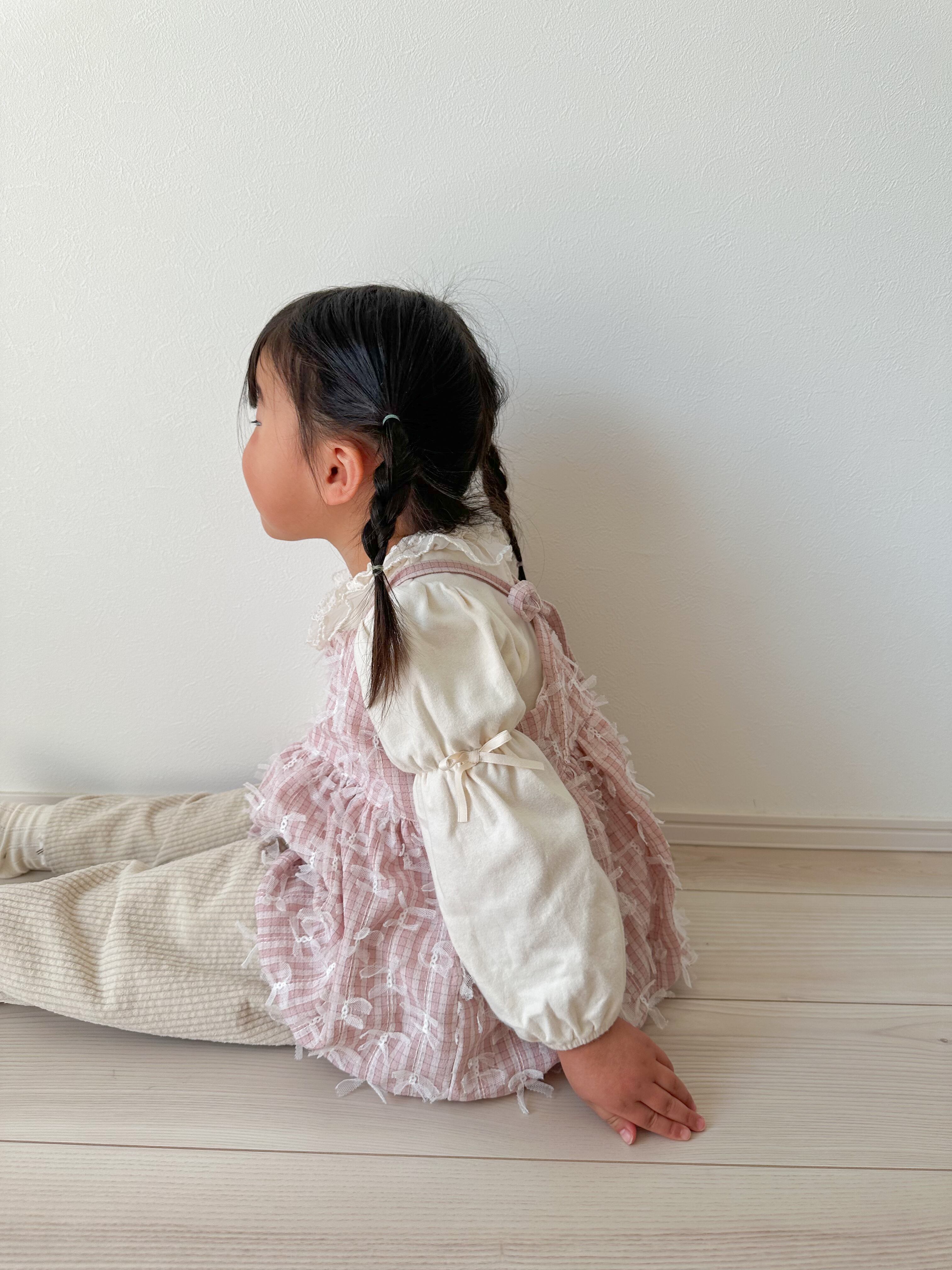 女の子らしいふんわりとしたシルエットのバルーンビスチェ。紐の長さを調整できるので、長く着ていただけるのも嬉しいポイント。1枚でコーデの主役に。
