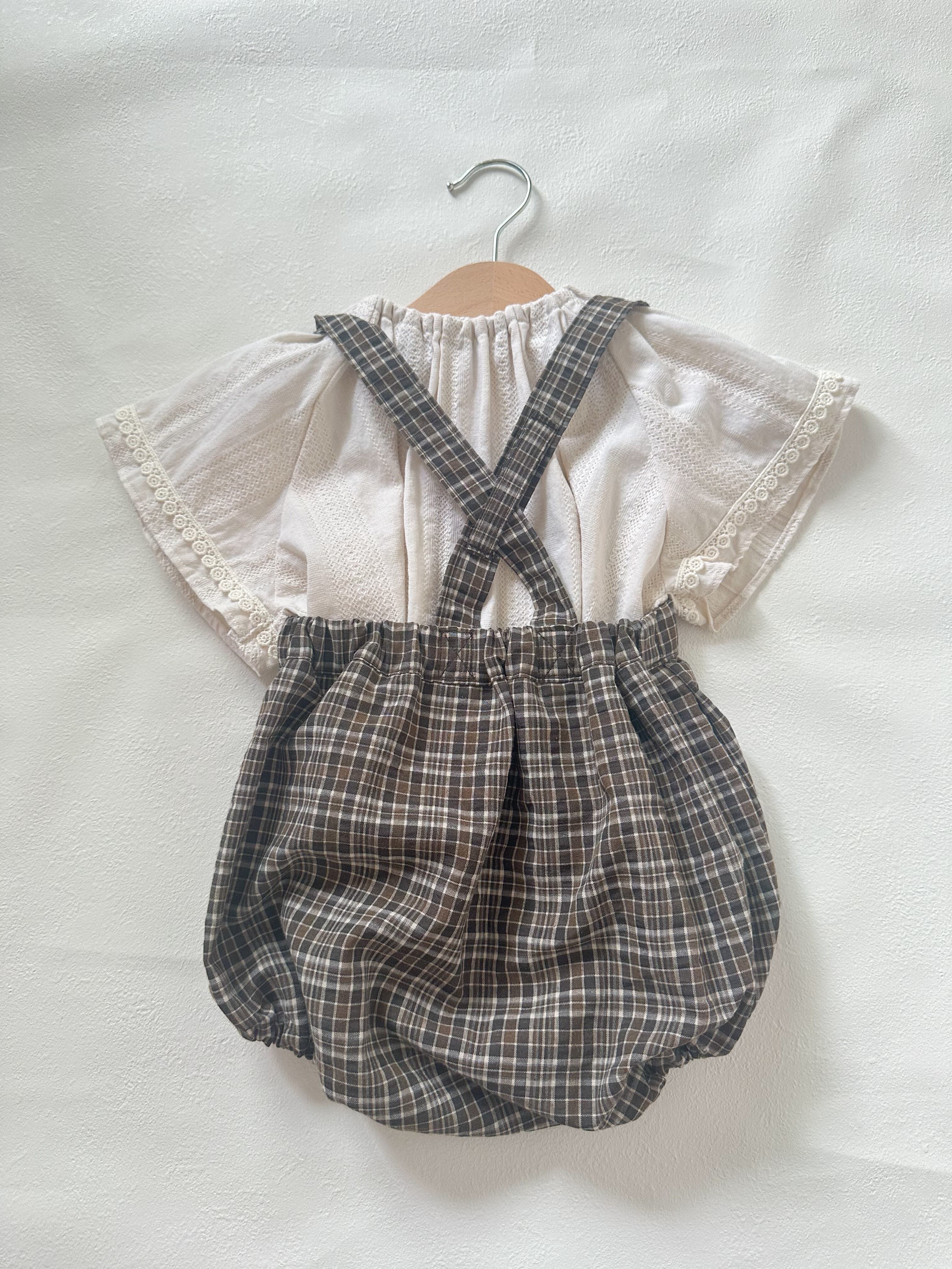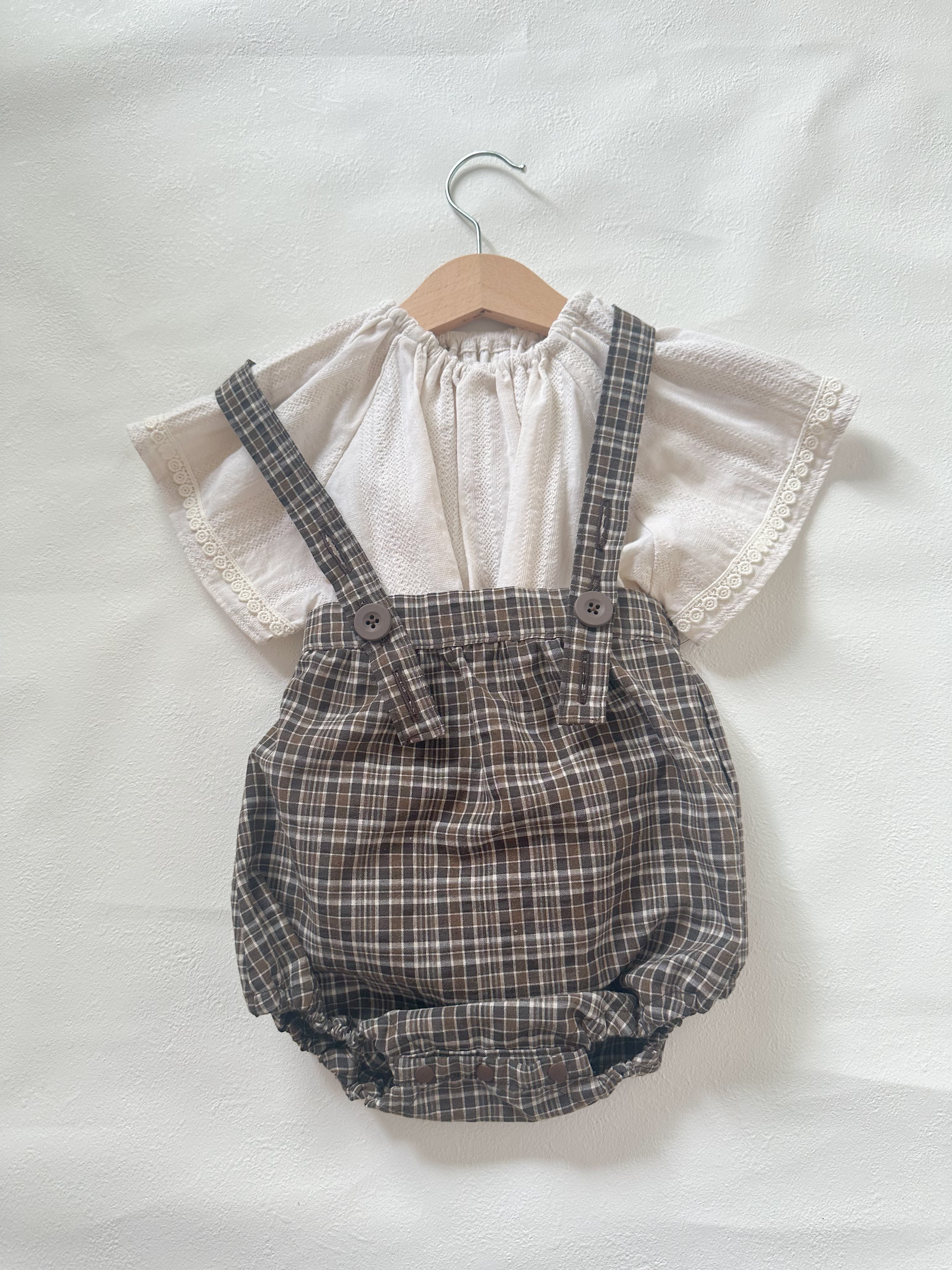 小さなころからおしゃれを楽しめる、サスペンダーブルマです。3段階のボタン調節ベルト。落ち着いたトーンのチェック柄が、どんなトップスとも相性抜群。ナチュラルな風合いで、普段使いから特別な日まで幅広く活躍します。